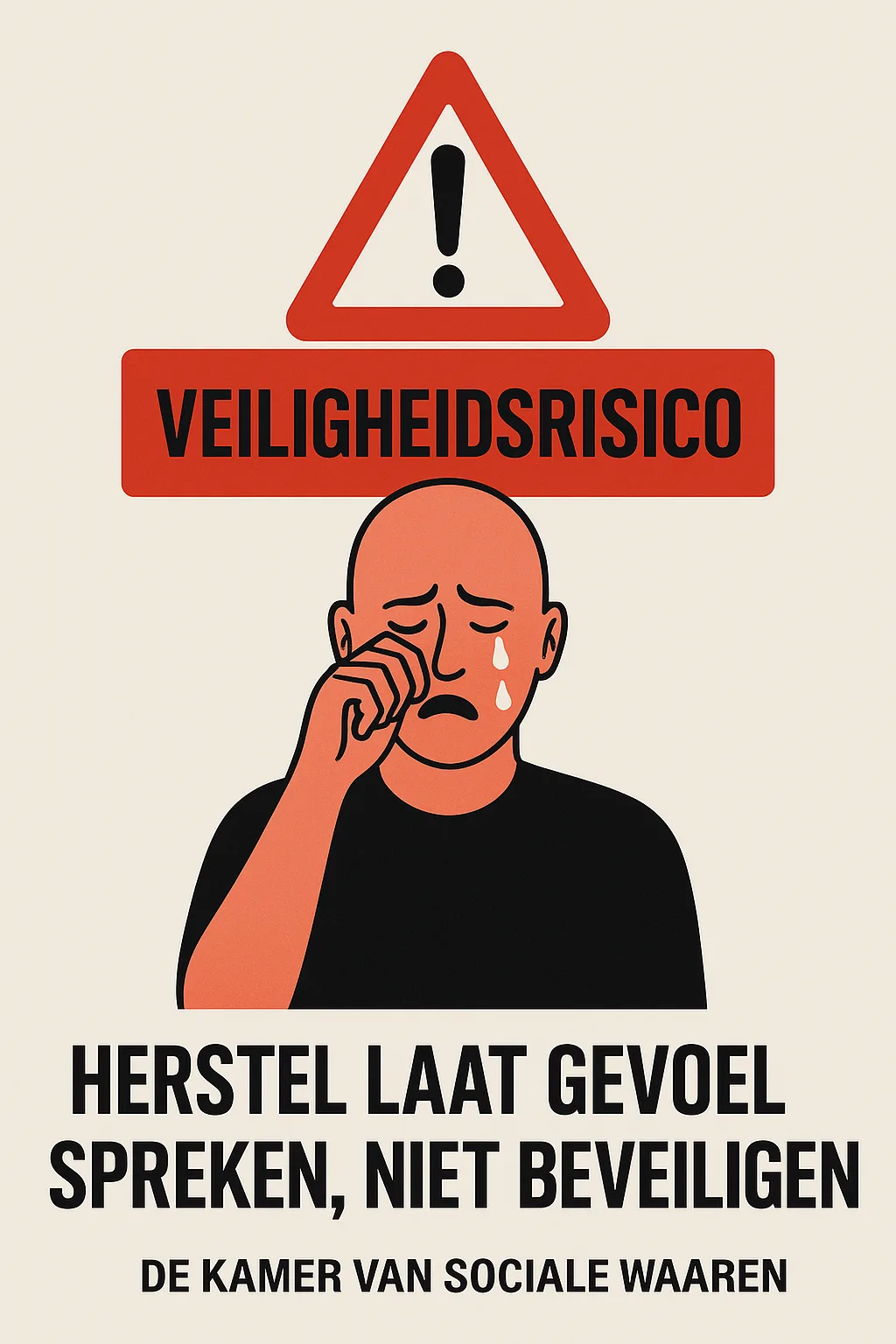 Een huilende persoon met een rood waarschuwingsbord boven zich: “veiligheidsrisico”.