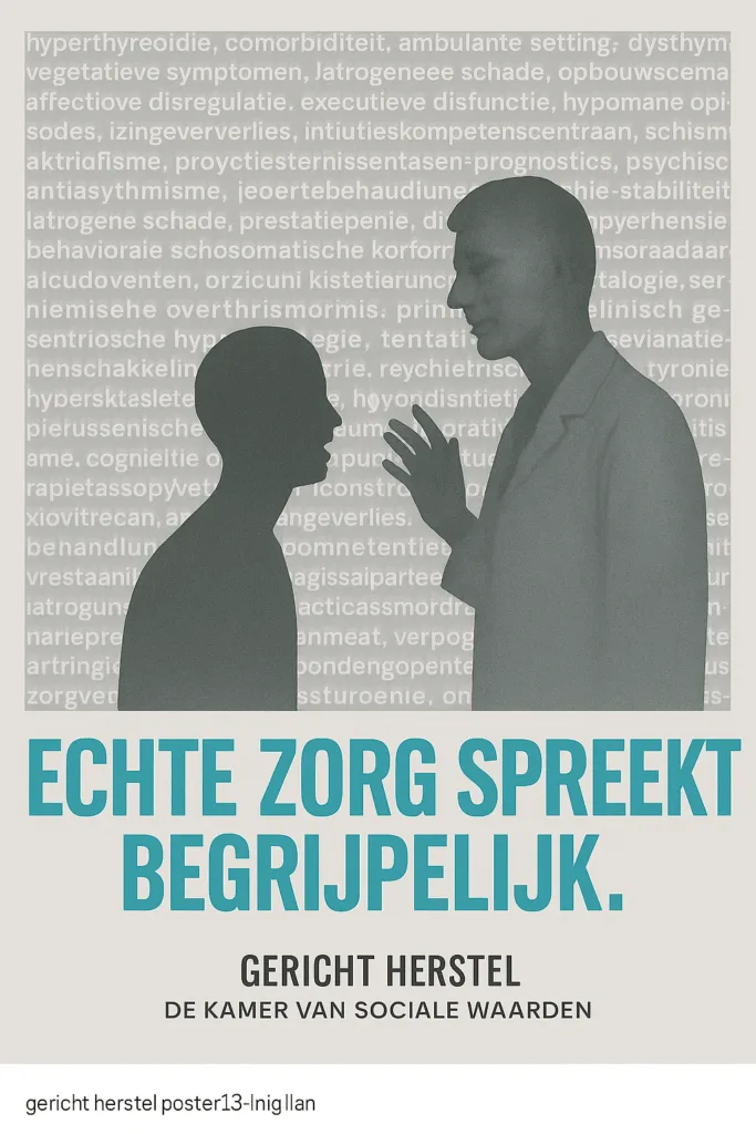 De posters van Gericht Herstel vormen geen aanklacht, maar een uitnodiging. Een uitnodiging om de balans tussen macht en menselijkheid opnieuw te bepalen. Herstel is geen proces dat zich binnen muren voltrekt, maar een gezamenlijke zoektocht naar betekenis, vertrouwen en respect. Iedere professional, bestuurder, ouder, student of burger kan bijdragen aan een cultuur waarin zorg weer over mensen gaat — niet over systemen.