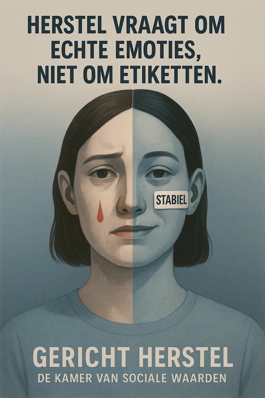Een gezicht in twee helften: links huilt, rechts glimlacht mechanisch met een sticker “stabiel”.