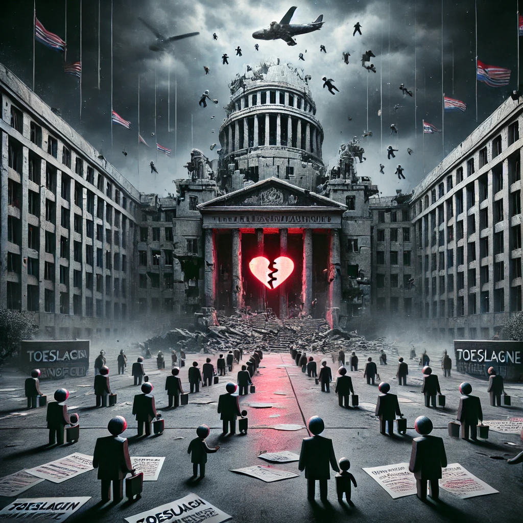 Schaduwachtige bureaucratische figuur: Op de achtergrond doemt een duister, gezichtsloos silhouet op, dat de anonieme en kille overheid vertegenwoordigt die verantwoordelijk is voor deze tragedie.