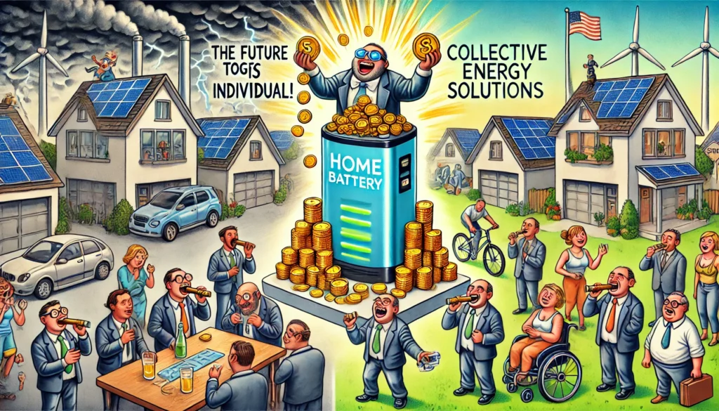 Het probleem zit dieper. De thuisbatterij trekt de energietransitie volledig uit de collectieve sfeer en plaatst het in de handen van individuen. Geen gezamenlijke energieopslag, geen samenwerking op buurtniveau, geen sociale innovatie. Iedereen moet z’n eigen batterij, z’n eigen risico, z’n eigen ‘onafhankelijkheid’ regelen. Maar energie is bij uitstek een gemeenschappelijk goed, iets wat we moeten delen en beheren als gemeenschap.
