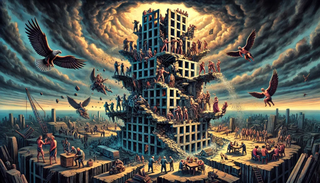 Is dit een vooropgezet plan, of simpelweg een onvermijdelijk gevolg van een systeem dat zichzelf ondermijnt? Net zoals in de legende van de toren van Babel, waar verdeeldheid en arrogantie leidden tot fragmentatie, lijkt de elite moeite te hebben om consensus te bereiken. De onderlinge strijd om dominantie verzwakt hun grip op de maatschappij en creëert ruimte voor nieuwe structuren gebaseerd op samenwerking en gedeelde verantwoordelijkheid.
