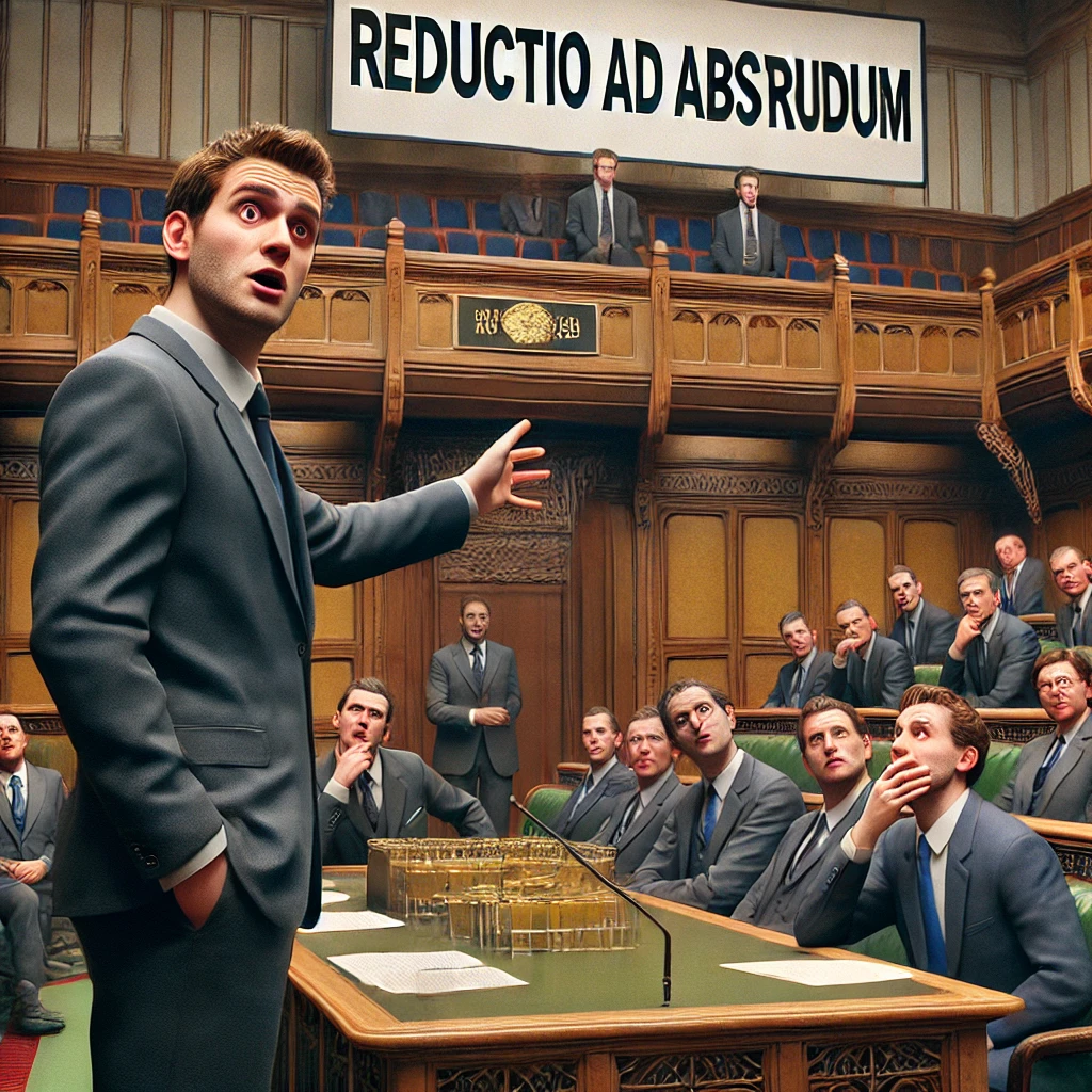 2. Reductio ad Absurdum – het overdrijven van het standpunt van de tegenstander om het belachelijk te maken.