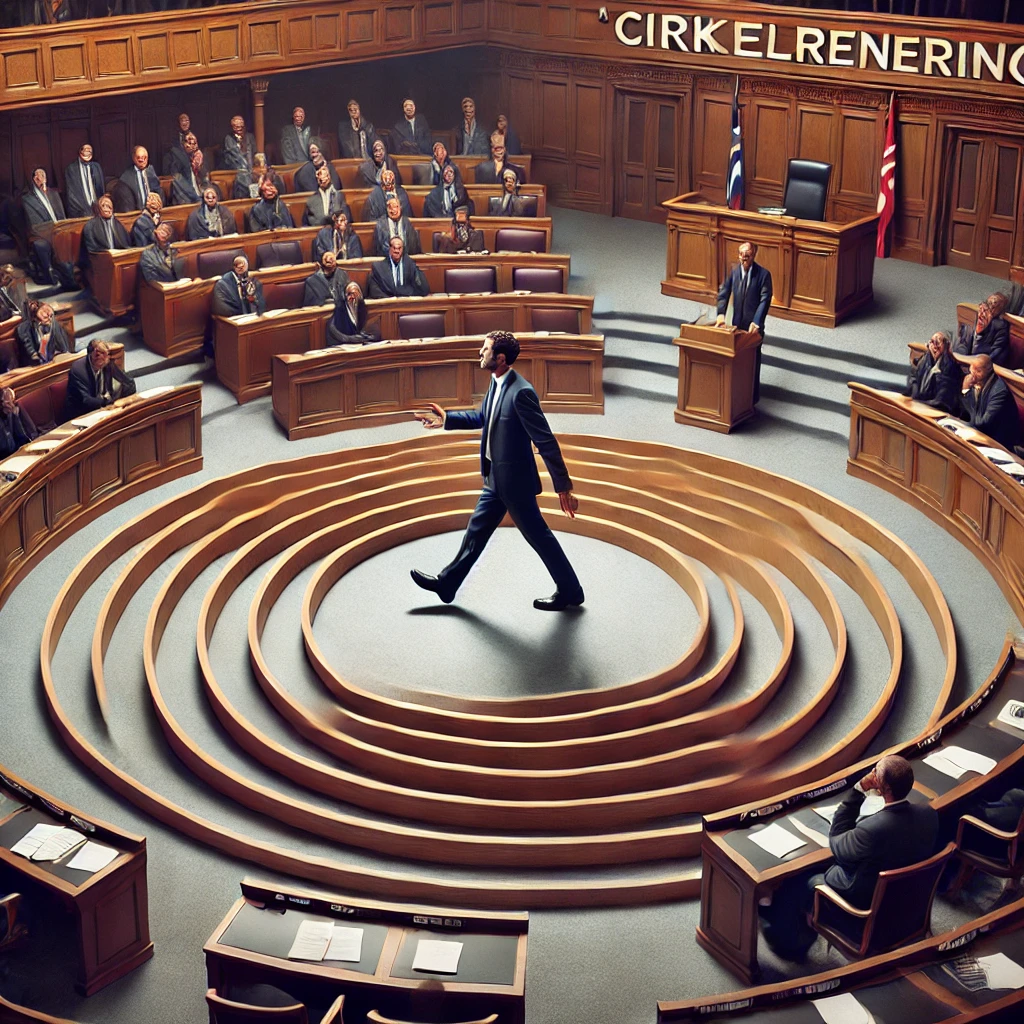 Cirkelredenering is fout omdat de minister niet blijft herhalen, maar wel beloftes doet zonder deze verder te specificeren.