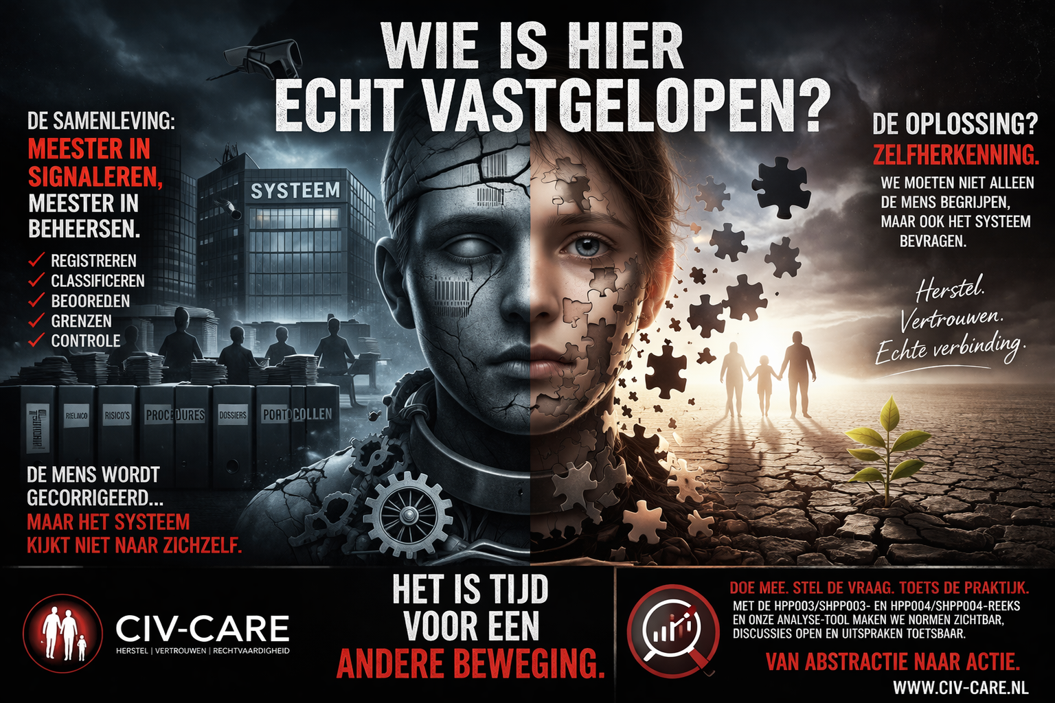 Deze bijdrage onderzoekt hoe de samenleving steeds sterker wordt in signaleren, registreren en begrenzen, maar zwakker in werkelijk herstel. Niet alleen burgers, ook instituties kunnen vastlopen in herhaling, rigiditeit en controle. De tekst vraagt om volwassen zelfonderzoek in zorg, bestuur, rechtspraak en onderwijs, en pleit via CIV-CARE voor een omslag van schadebeheer naar herstelplicht, transparantie en menselijke verantwoordelijkheid binnen publieke systemen en relaties vandaag.